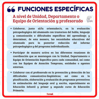 Desde la FEMAL siempre apostamos por establecer unas #funciones generales y unas funciones específicas en base a cuatro niveles: centro, profesorado, alumnado y familias, ya que entendemos que nuestra intervención va mucho más allá de la intervención directa con el alumnado con NEAE.